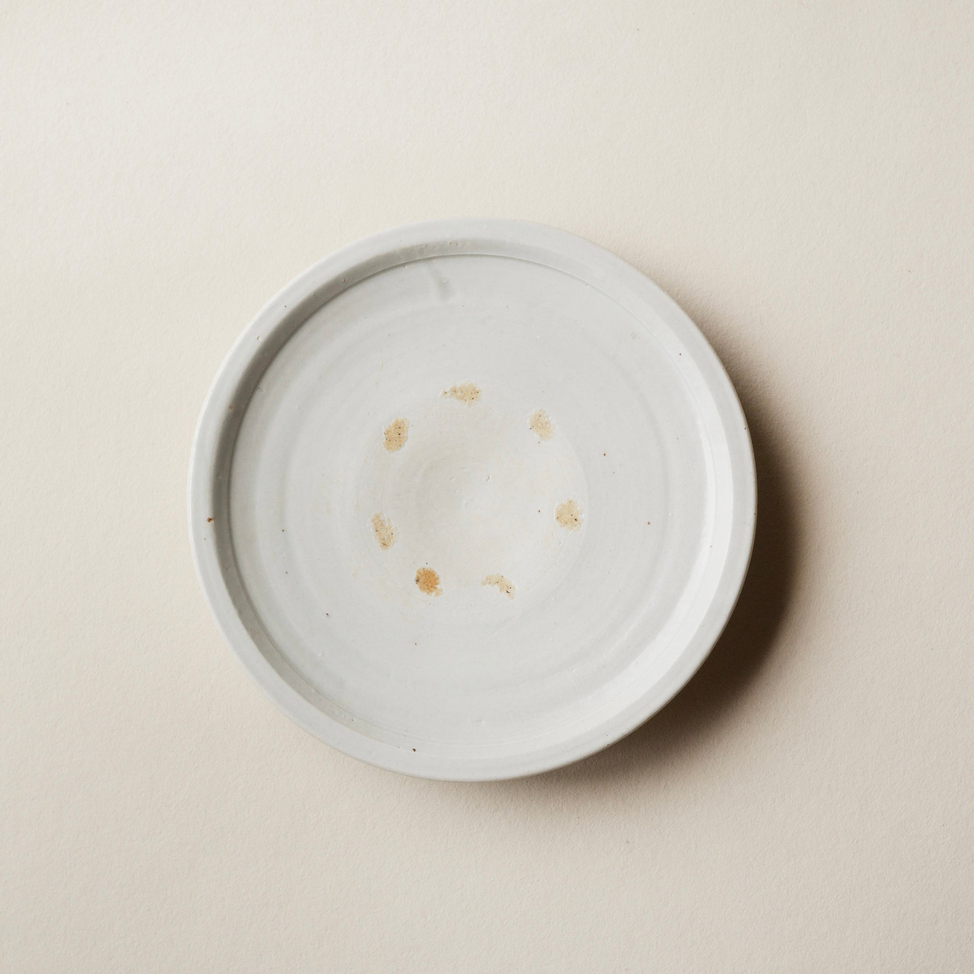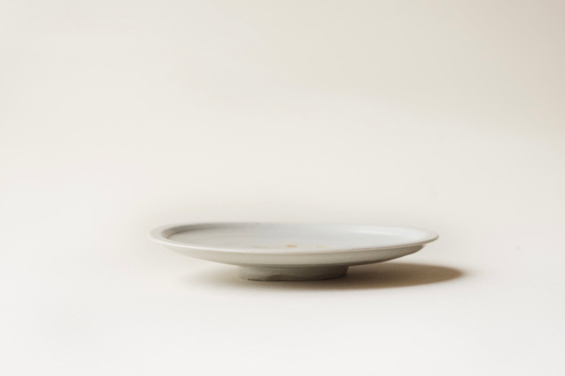 白磁の器。窪みのない平皿の形で、山や谷ができるような自然な調子で成形されています。磁器土を薄手に成形した轆轤仕事も関心するばかりですが、 高台の欠けによって平衡がとれなくなったのか器は平面に置きますと傾いています。