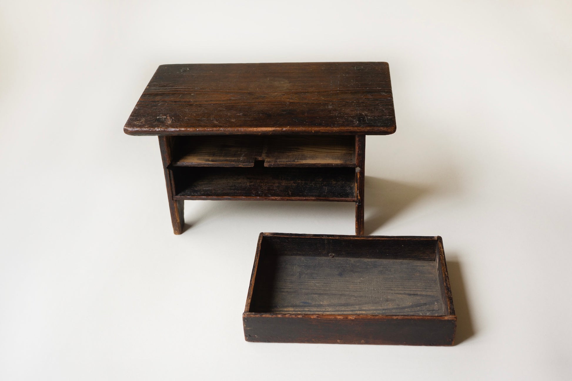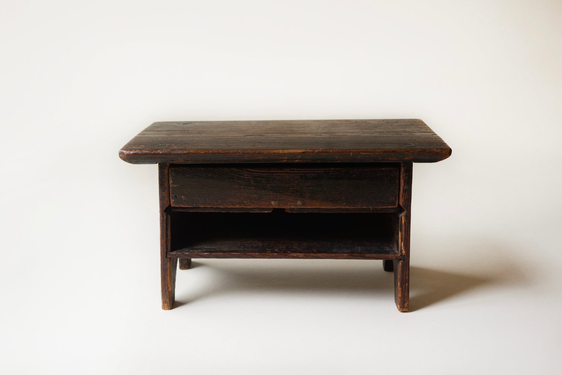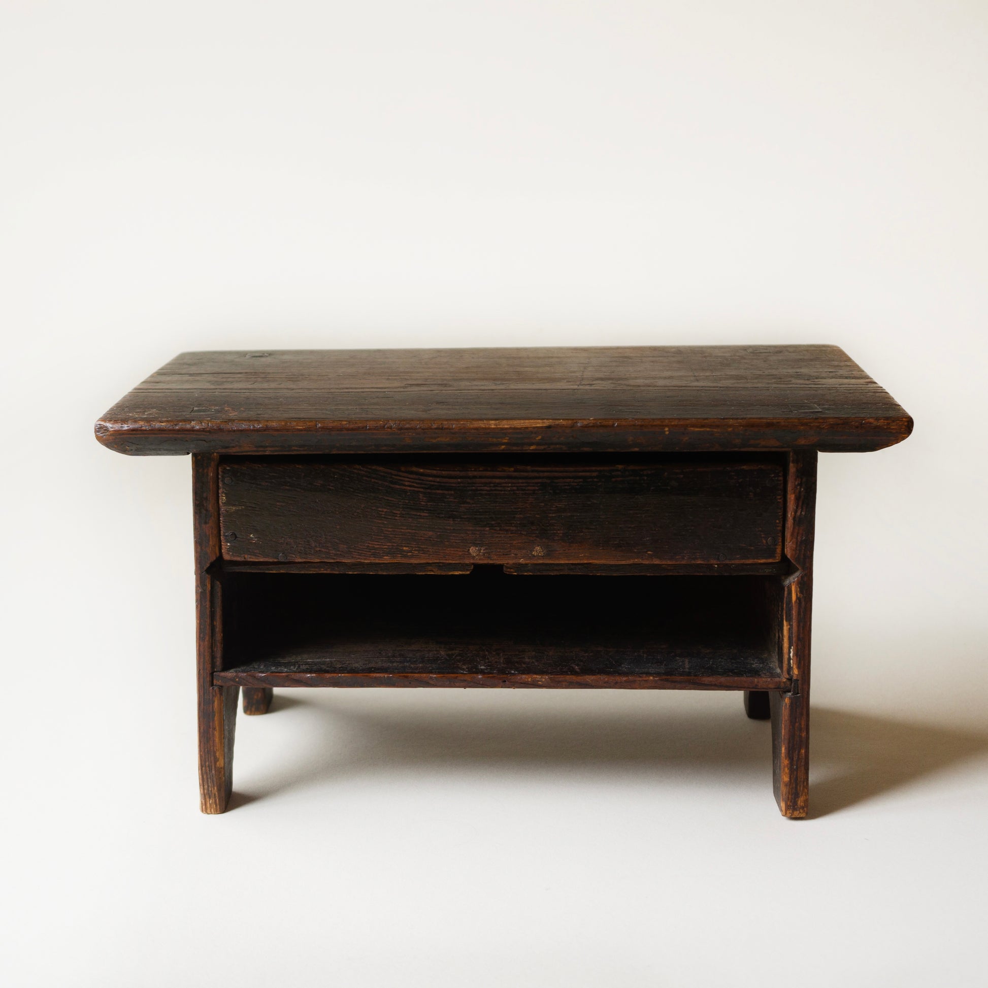 李朝家具で本歌と呼ばれる古い書案(文机)は数が少なく、またこのように小さな座卓ともなると一段と見かけないものになります。朝鮮家具の素朴さのある形に木味は上々で、書案と言いながら長らく花台に使われていたものと思われます。