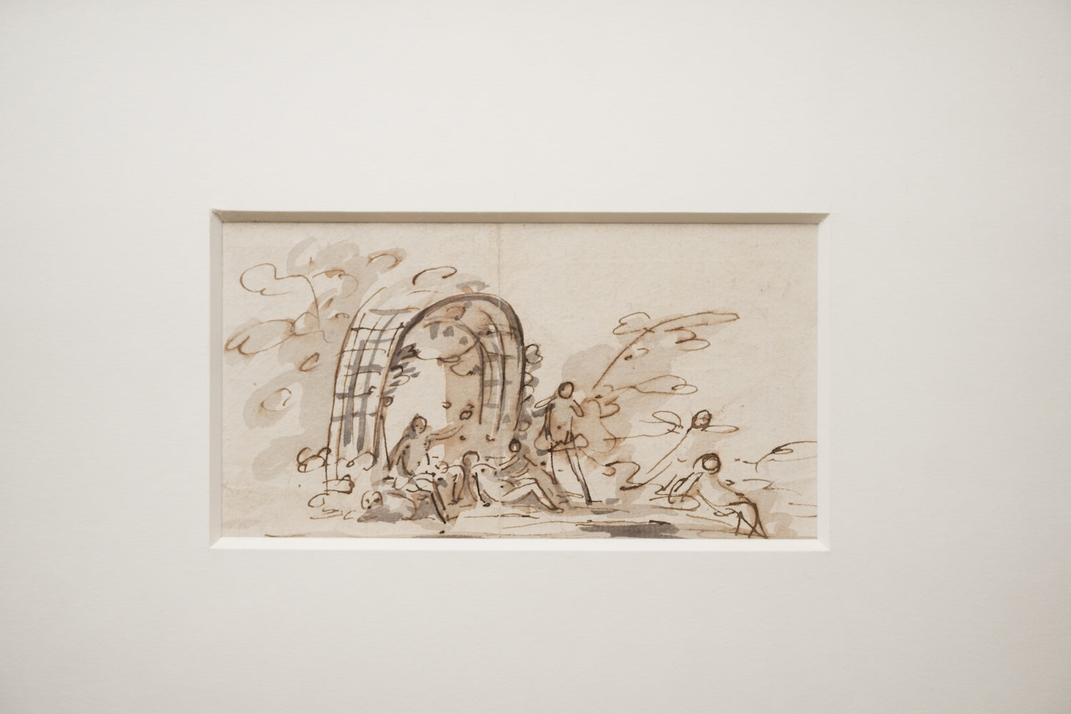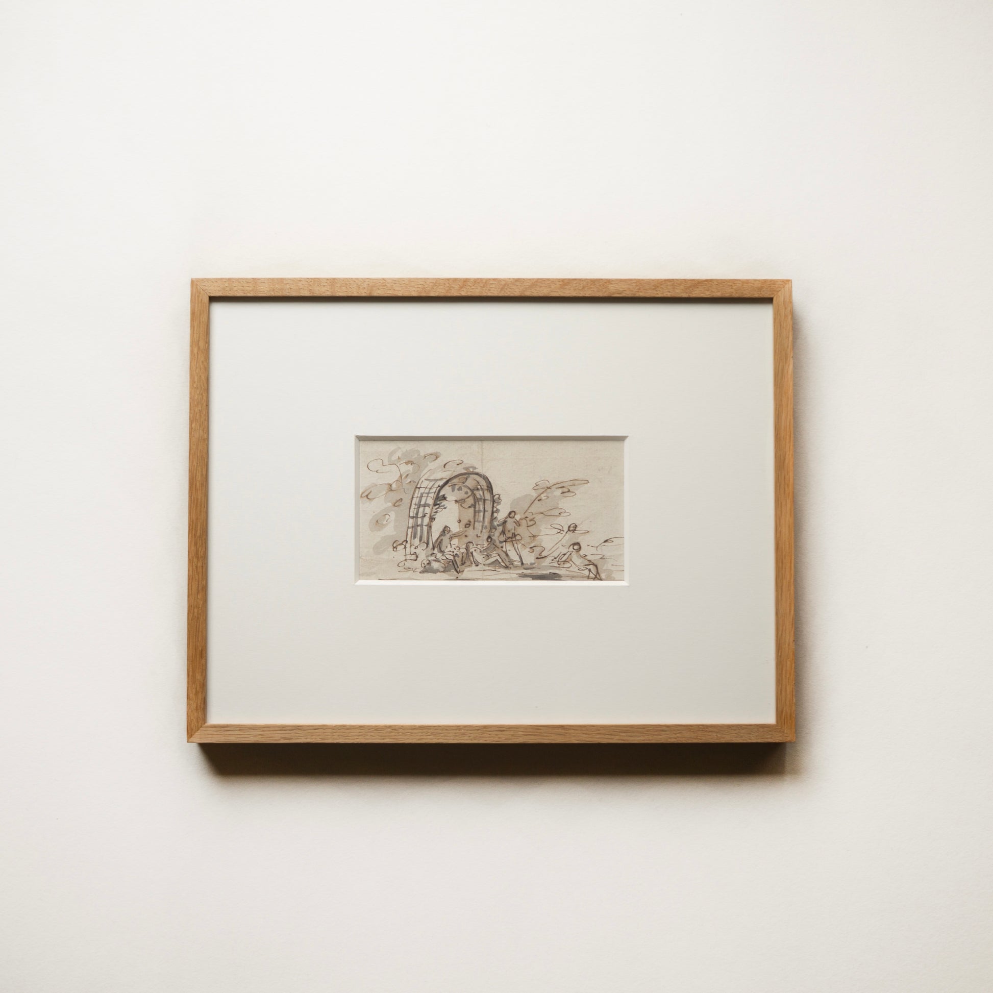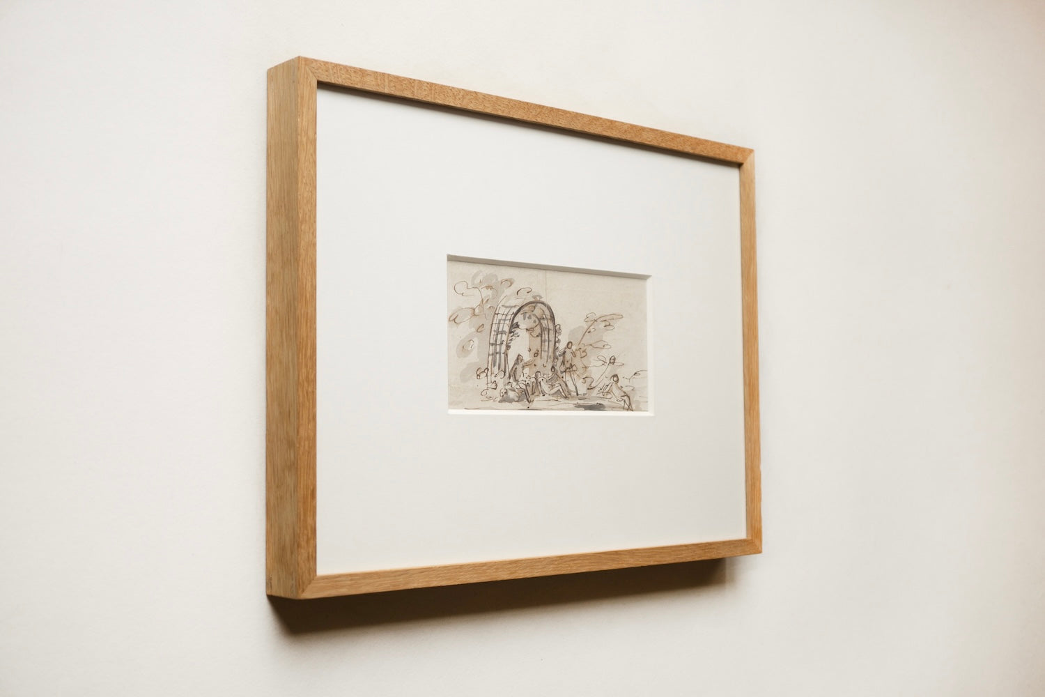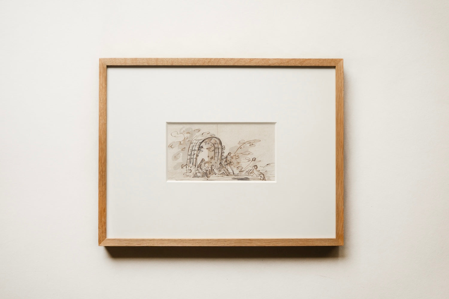 スチールペンや万年筆が発明されるより以前の羽根や葦を削ったペンで、手漉き紙に水彩(グレーウォッシュ)を加えてレンブラント風にスケッチされた一葉。小さなスケッチブックの一部かアイディア帳のようなものからとられたものらしく、紙は二つに折りたたまれ、古典の気配を漂わせたもの。おそらく1800年前後。