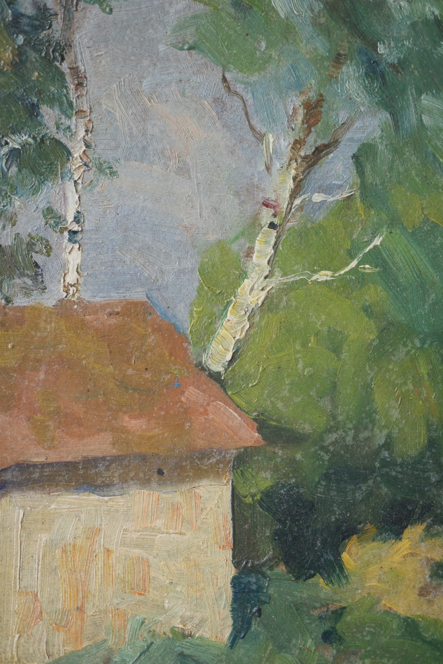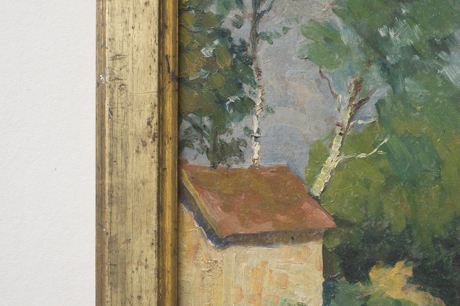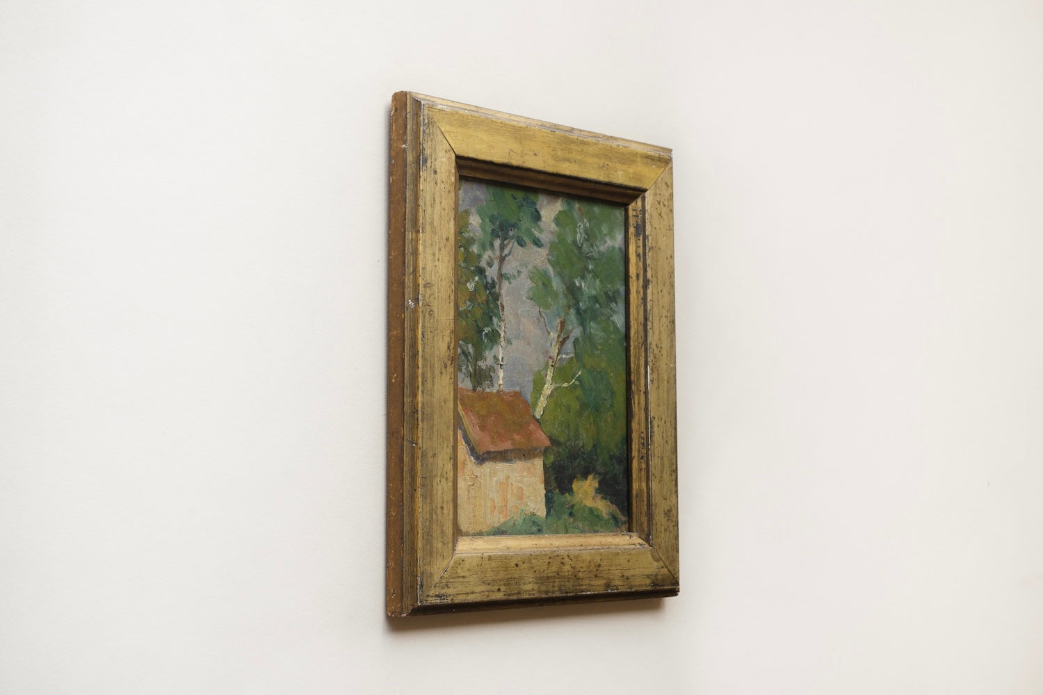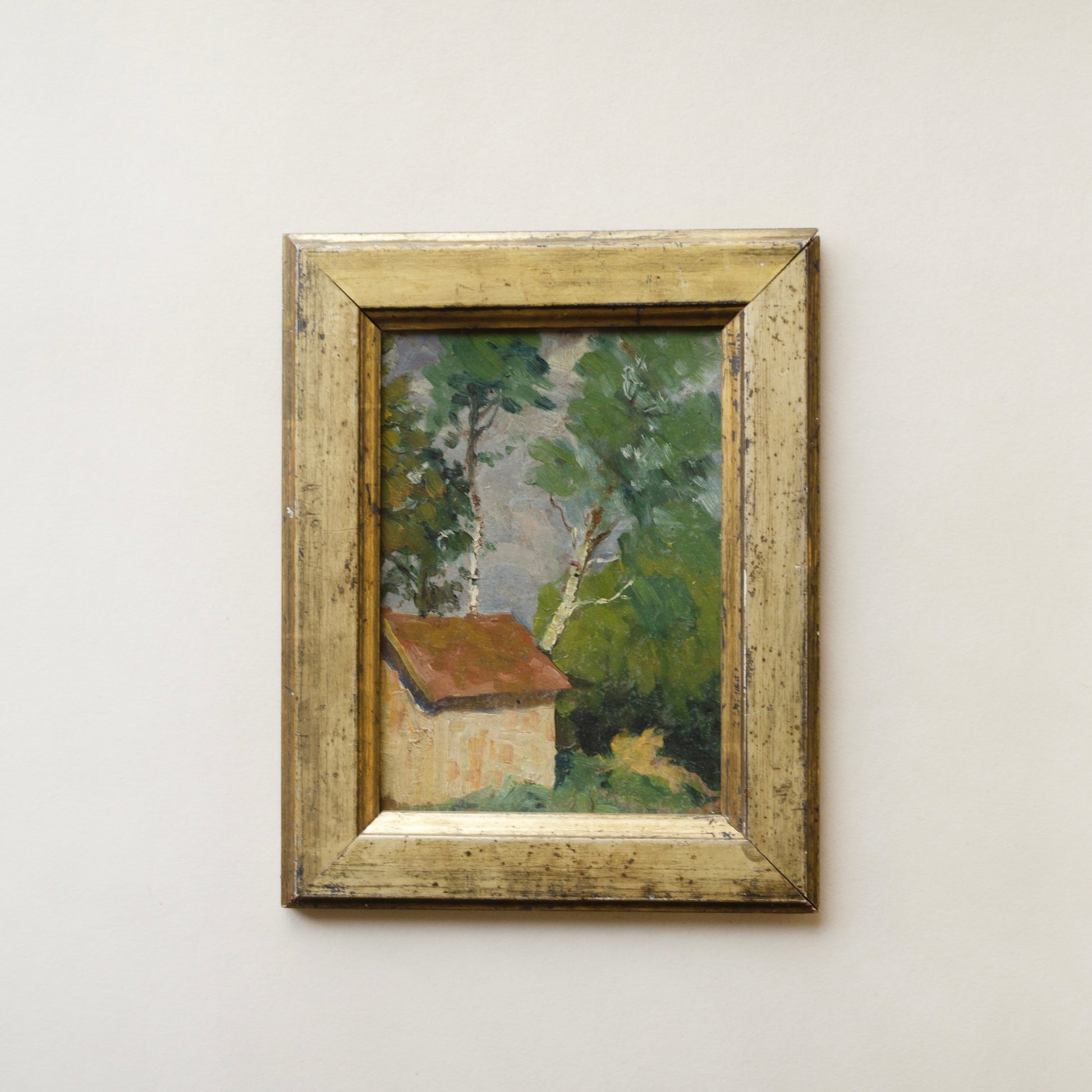 最近になってマエストロから譲り受けたもので、おそらくフランスで描かれた作品と云う。一号サイズの小じんまりとした絵で、正面にある小づくりな建物と、楡の木のような雑木が繁ったよく陽のあたる土地。建物は庵のようにも農作業小屋のようにもみえて、曖昧なところが曖昧なままで、強固な印象を与えない代わりに見飽きることのない絵です。