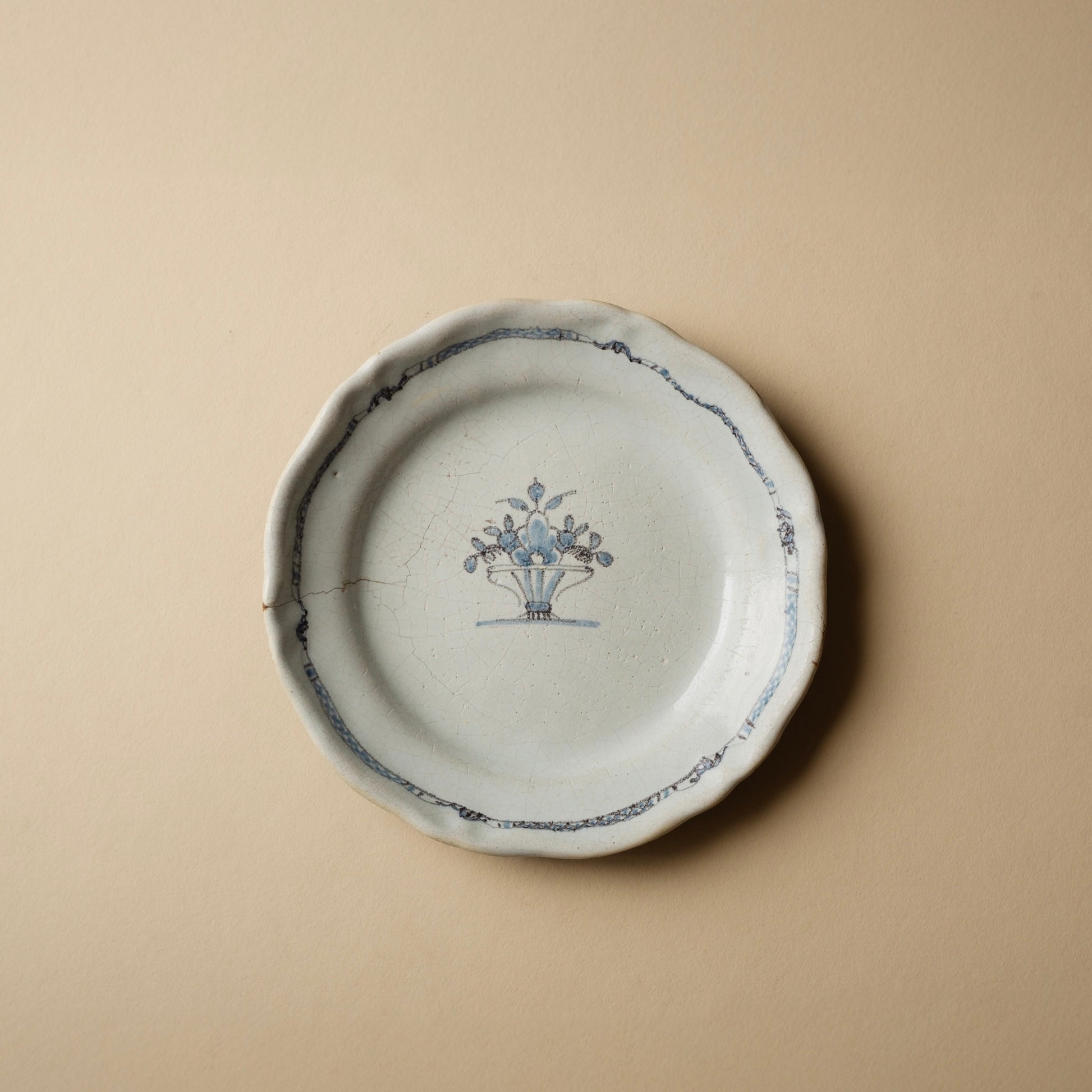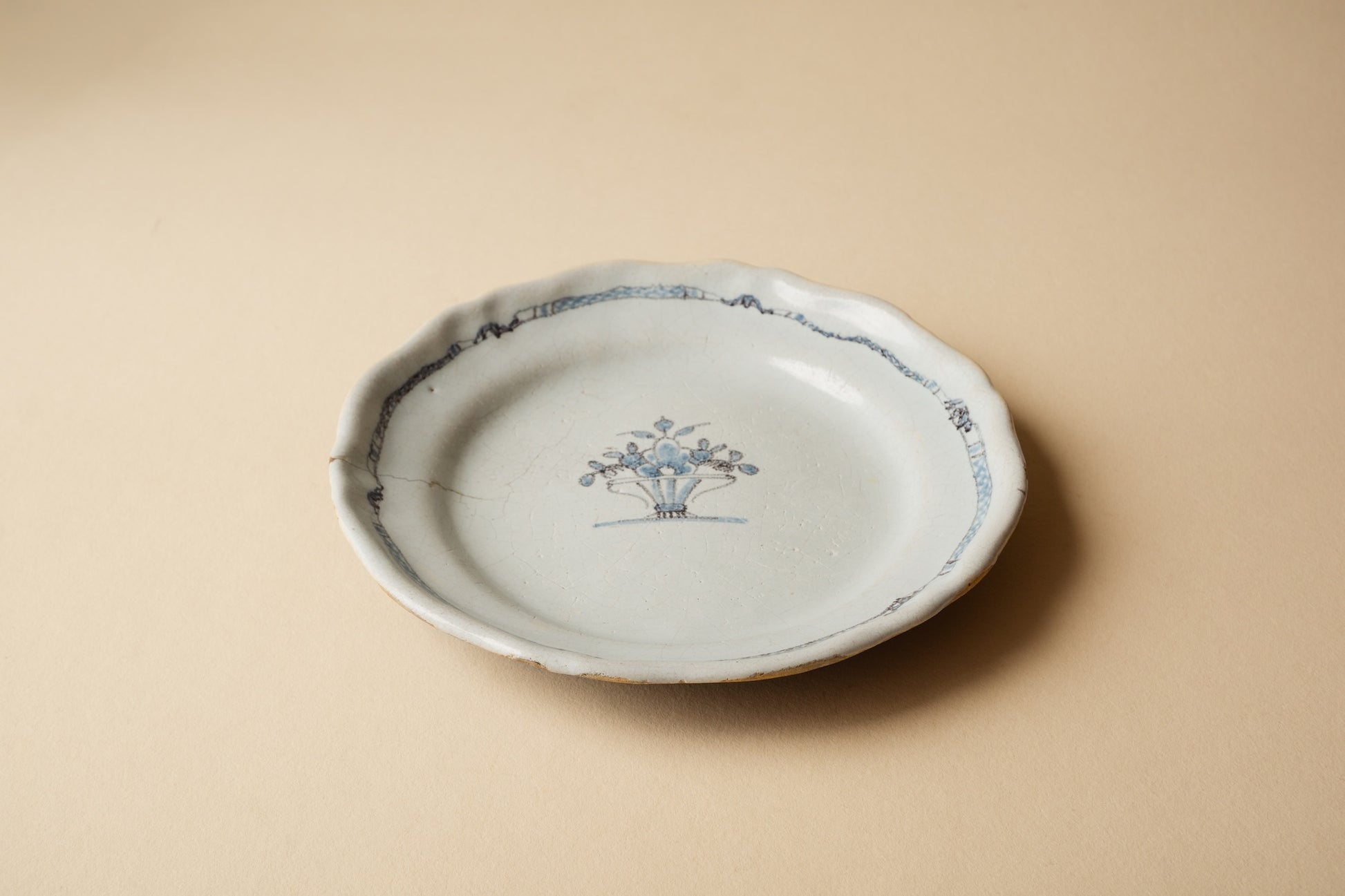 フランスの古陶では「花瓶の花」を題材にした絵皿で、パン生地を手で捏ねたように無造作な輪花形をしています。