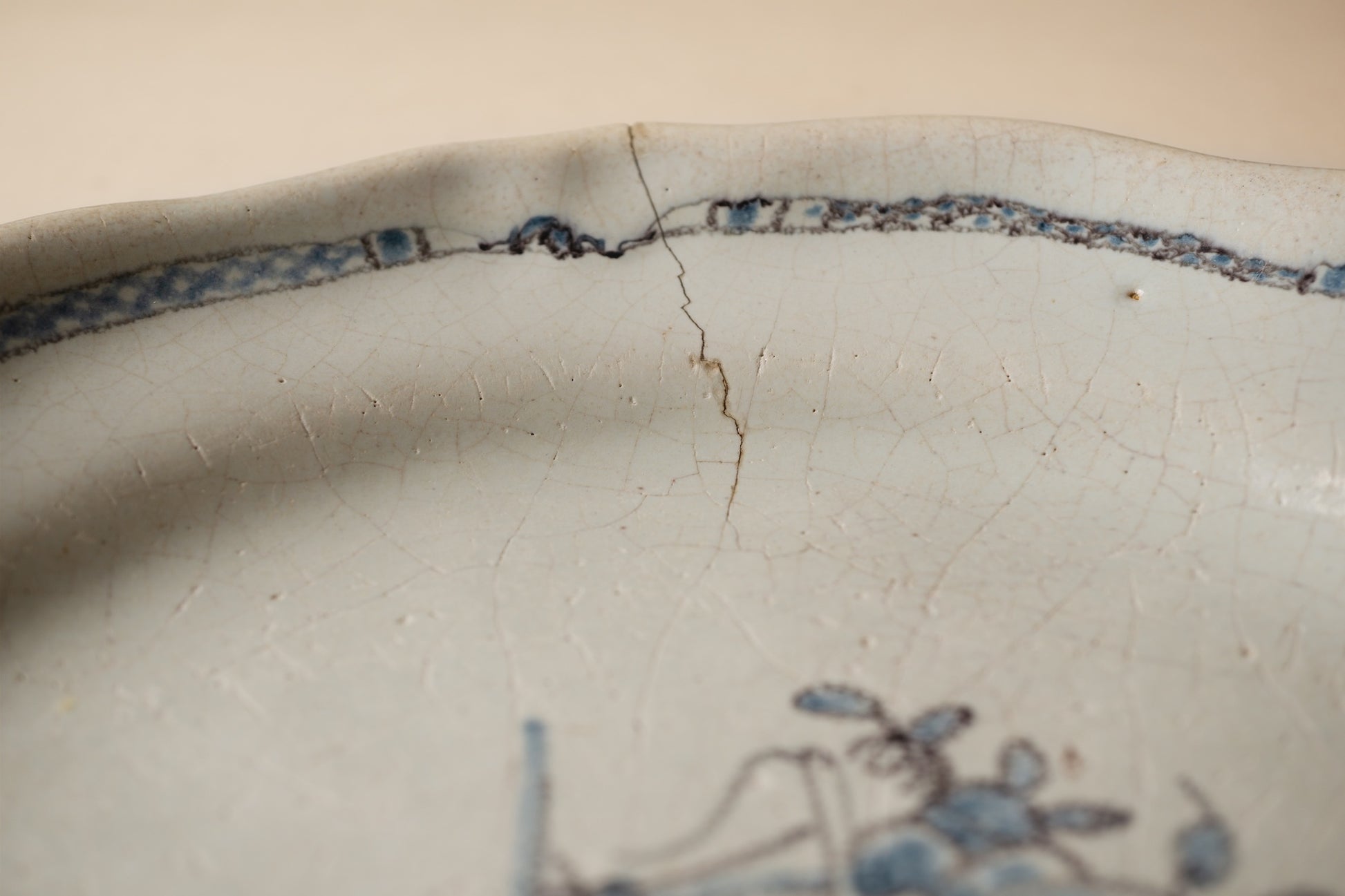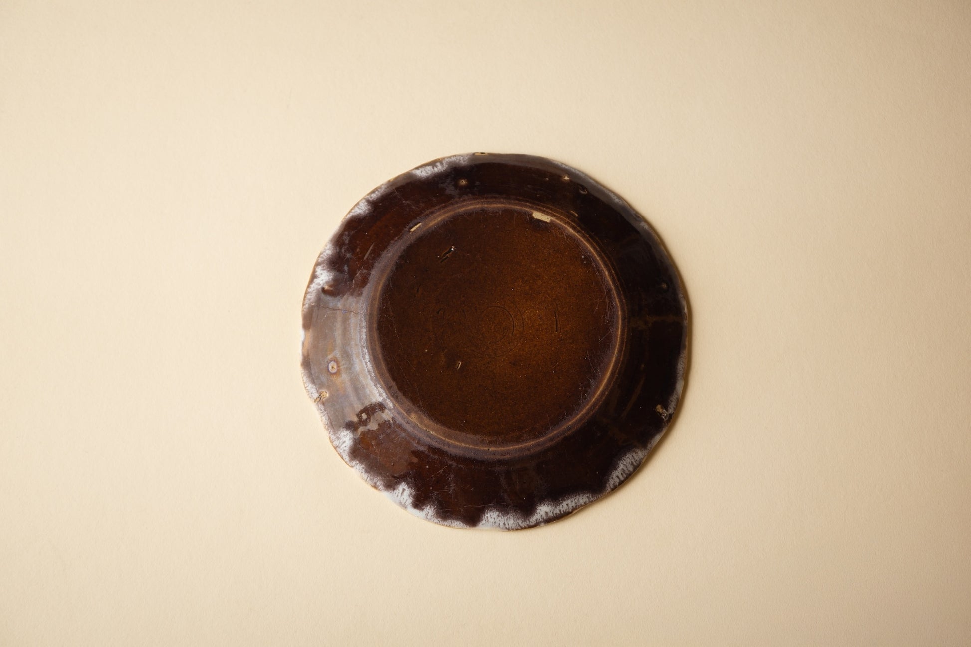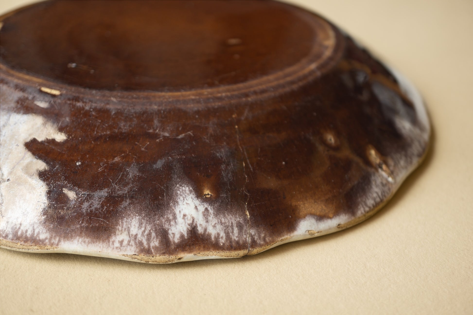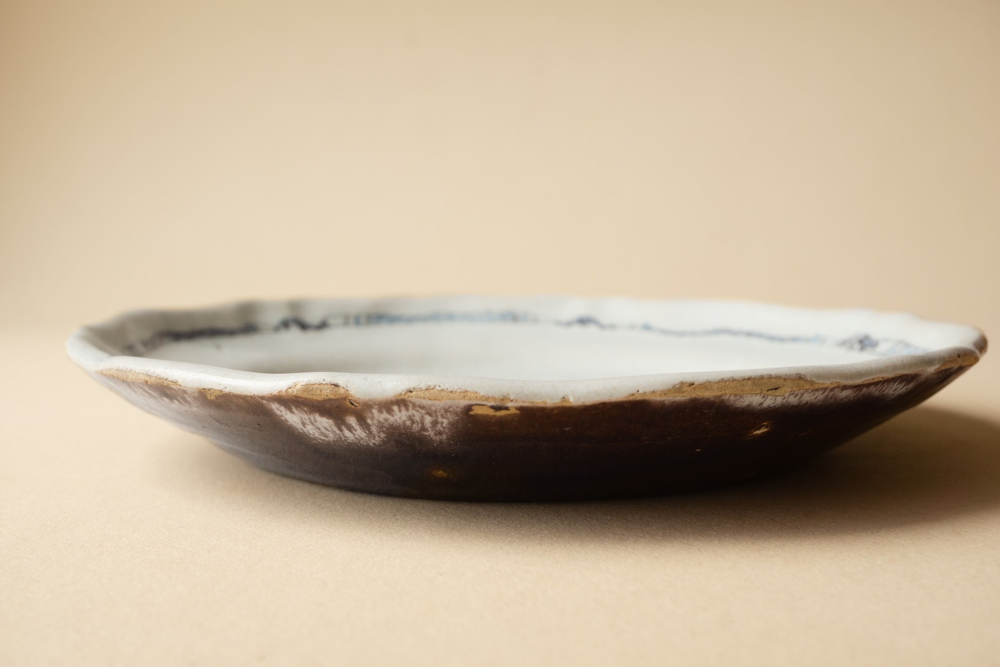 陶土に錫釉、背面は酸化マンガン等を調合した釉薬で、器として日常的に使えるところが利点です。目止めをしてからご使用ください。器の一部に細いヒビが通り、補修痕がうっすらと見えます。