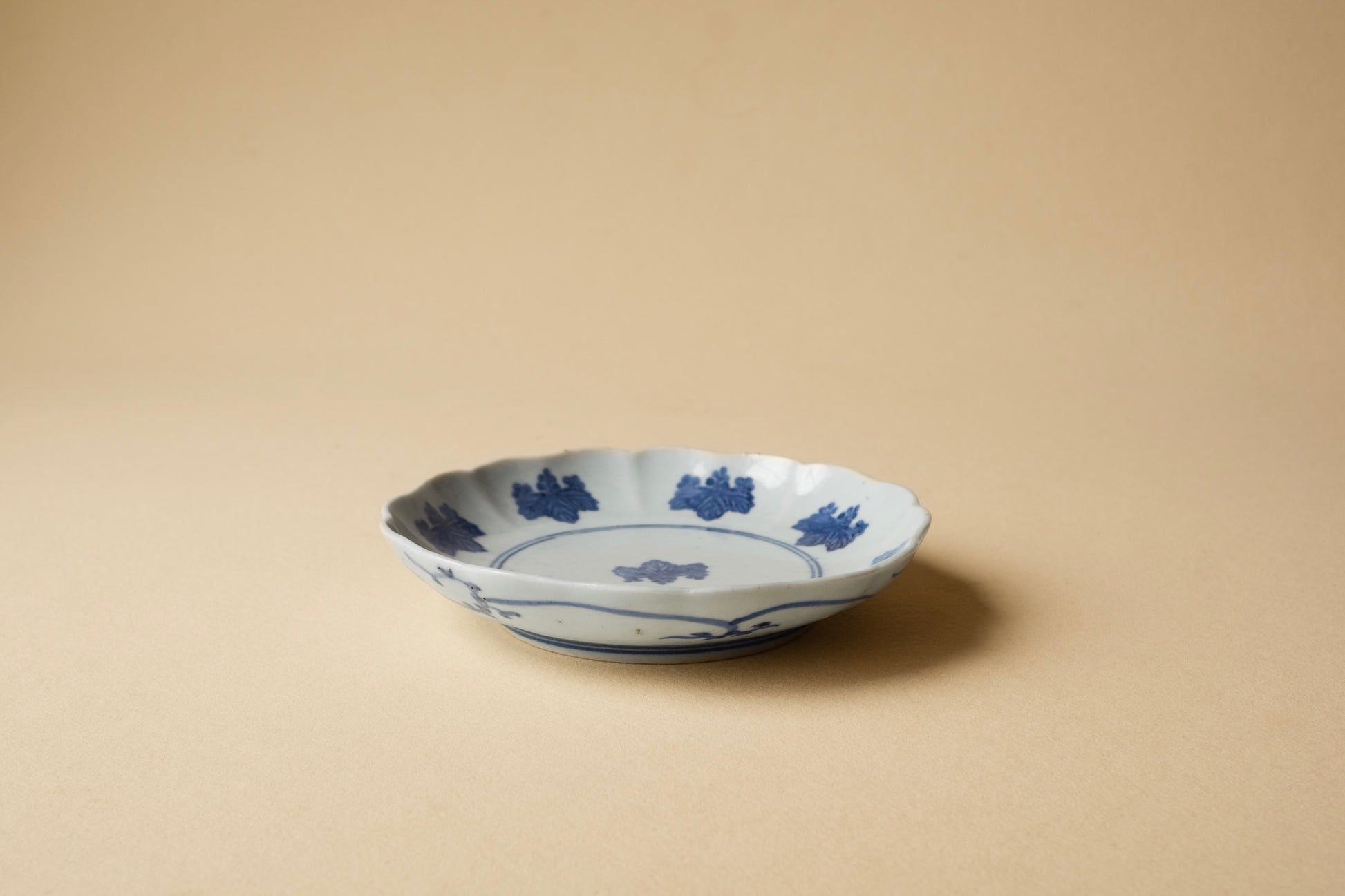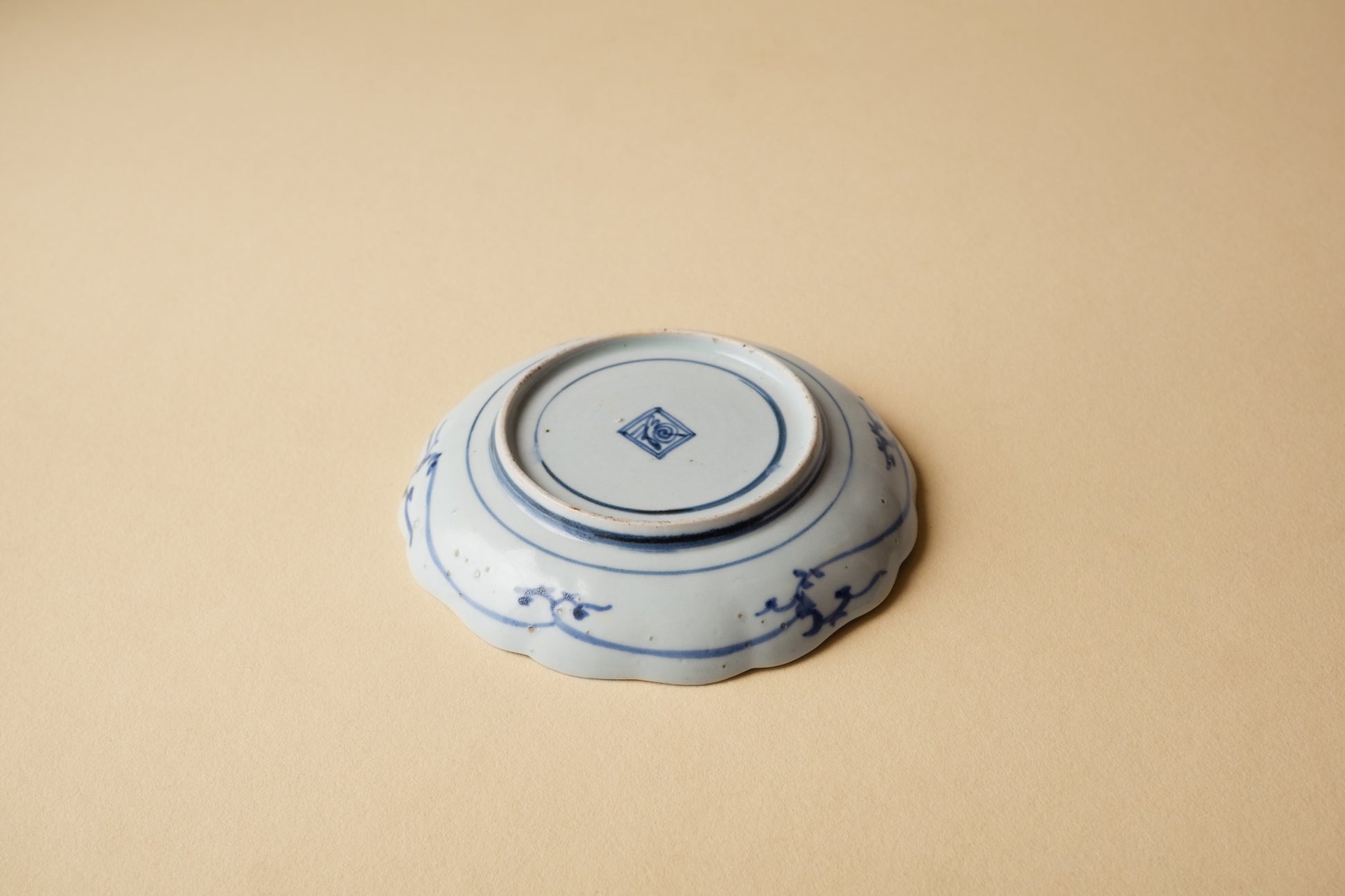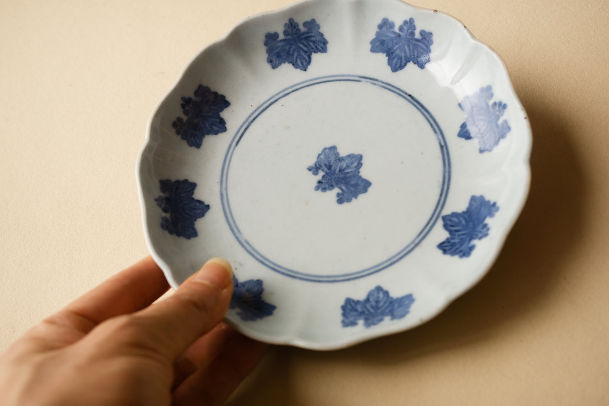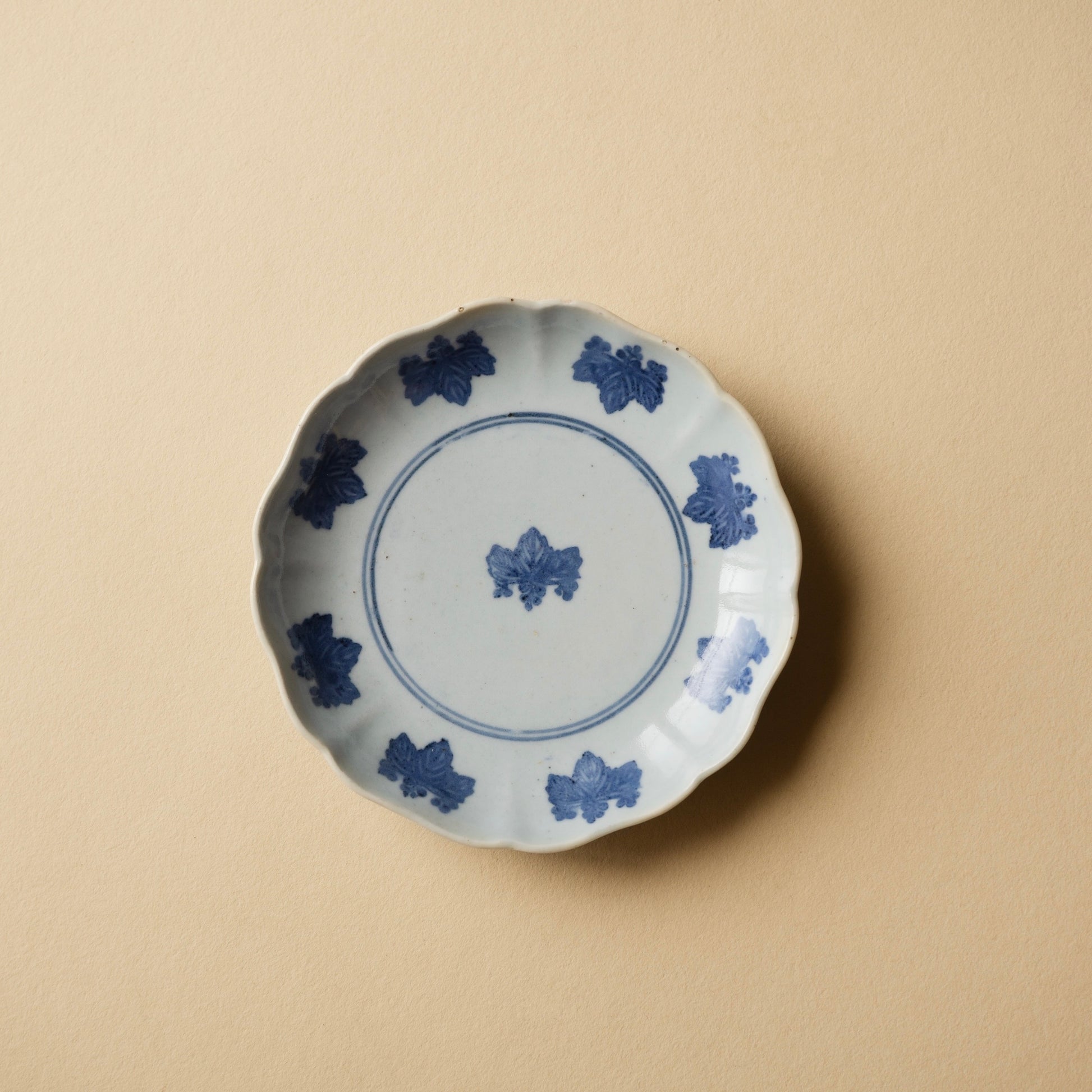 コンニャク印判というのは通称で、型紙などではなく柔らかいものを型にしていたらしいことからの呼称だったと思います。こちらは輪花の形によく合った図様で日々の器としても気兼ねなくお使いいただけます。